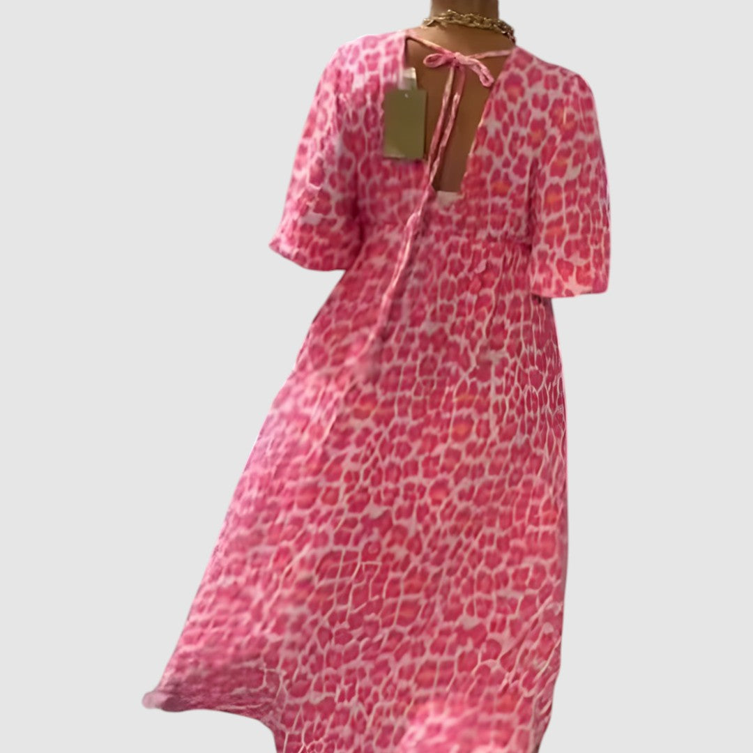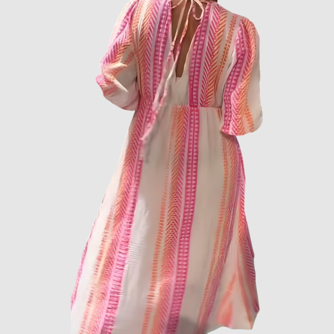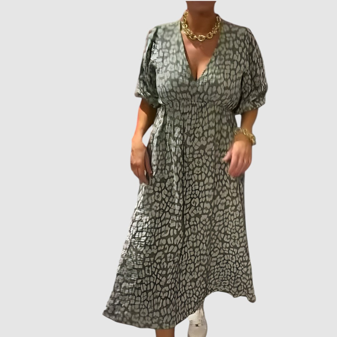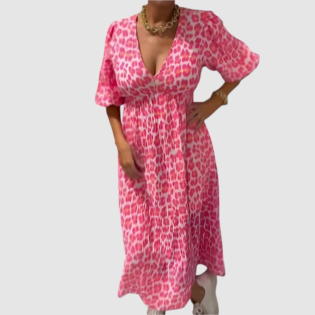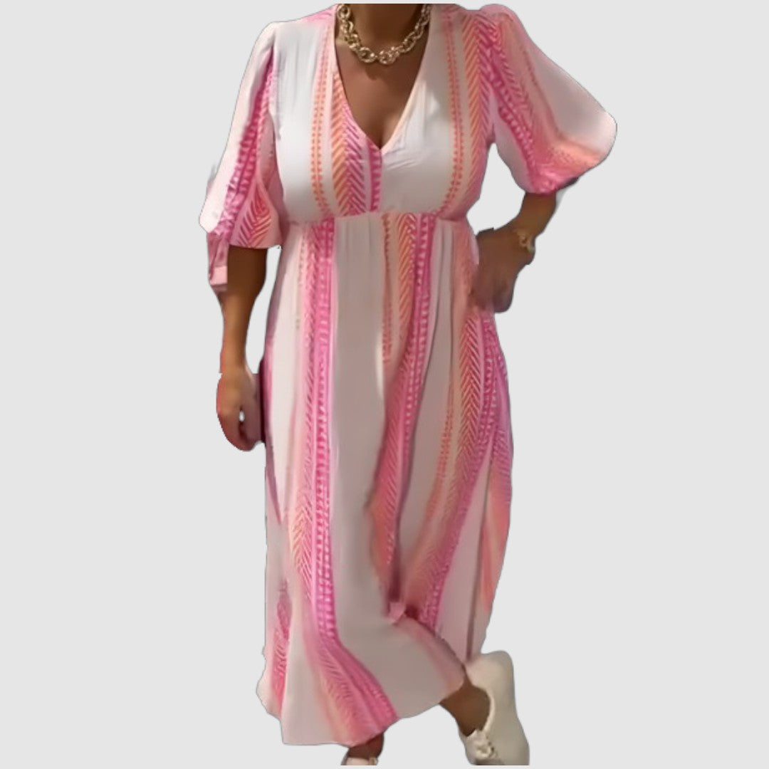 Pohodlné a stylové šaty, které spojují ležérní střih s elegantním designem. Díky volnému padnoucímu střihu a vzdušnému materiálu jsou ideální pro každodenní nošení i letní procházky. Výstřih do V a široké rukávy dodávají model ženský a trendy vzhled.