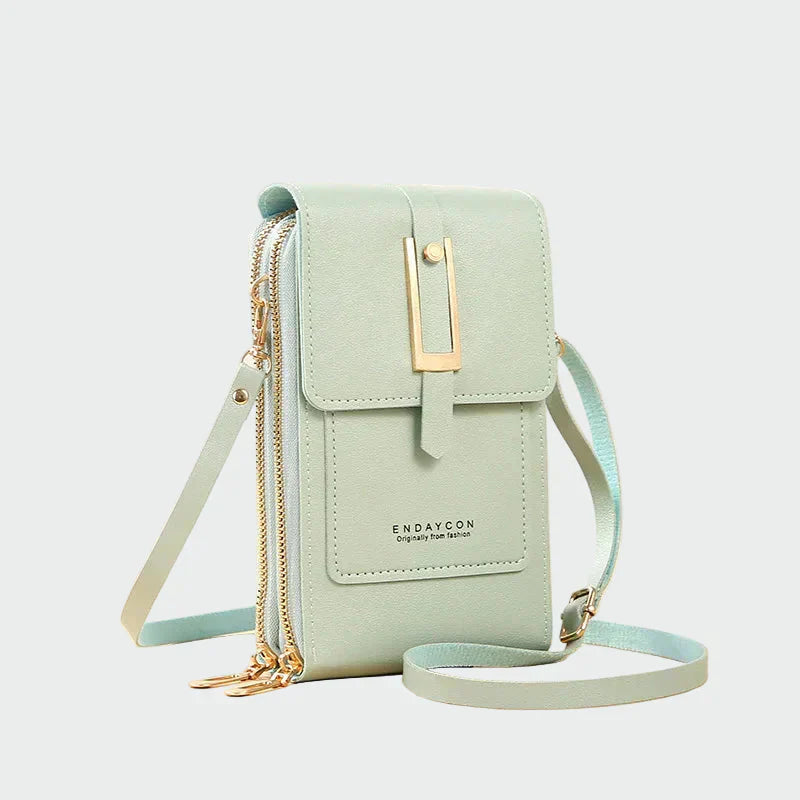 Malá crossbody taška v jemné zelené barvě s elegantním a moderním designem. Disponuje víkem s kovovým detailem ve zlaté barvě a dvojitými zipy, které nabízejí praktickou organizaci a bezpečnost. Lehké ramenní popruhy umožňují pohodlné nošení, což ji činí ideální volbou pro každodenní procházky nebo cestování. Doplněk, který kombinuje svěžest, styl a funkčnost.