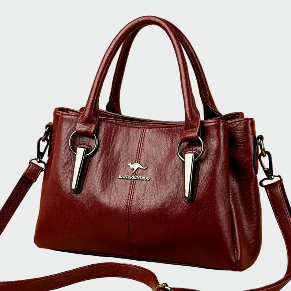 Elegantní dámská kabelka v bordó odstínu s nadčasovým designem, který vyzařuje jemnost. Disponuje odolnými uchy pro pohodlné držení a také odnímatelným ramenním popruhem pro větší pohodlí. Kovové detaily v stříbrném tónu dodávají moderní nádech, zatímco její praktická velikost ji činí ideální pro každodenní použití, ale i pro elegantnější příležitosti.