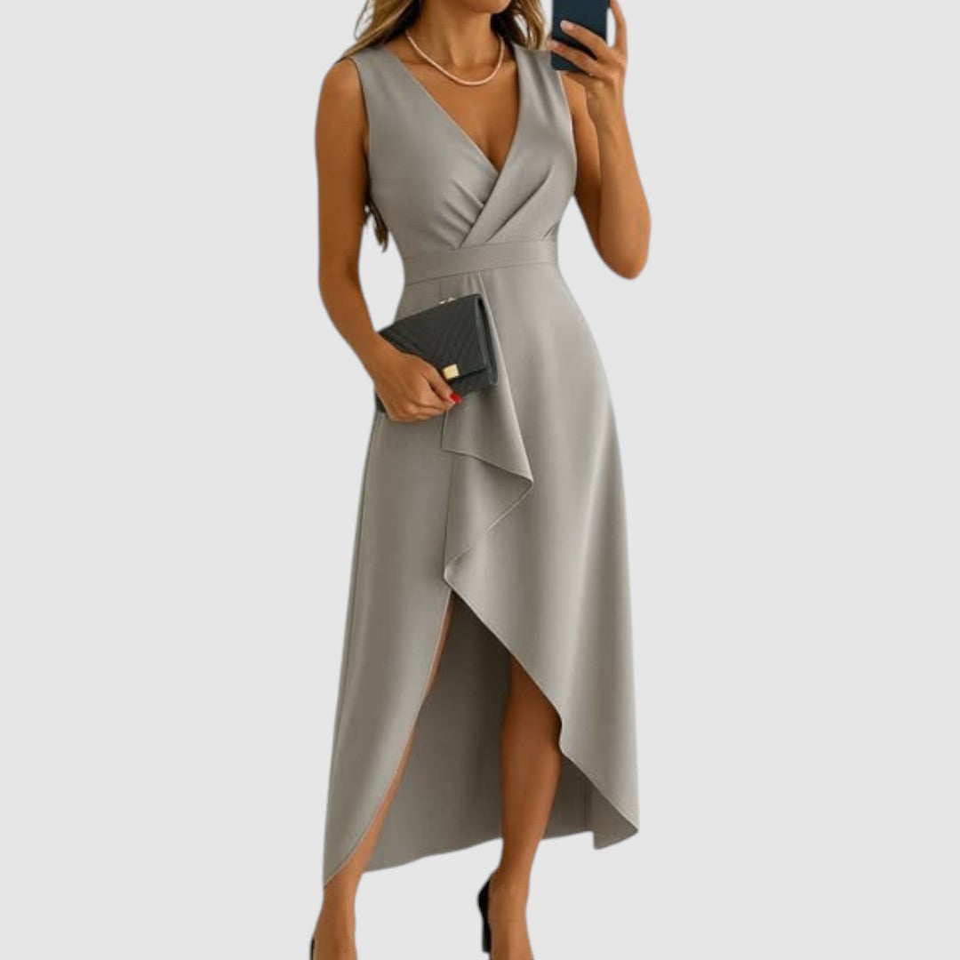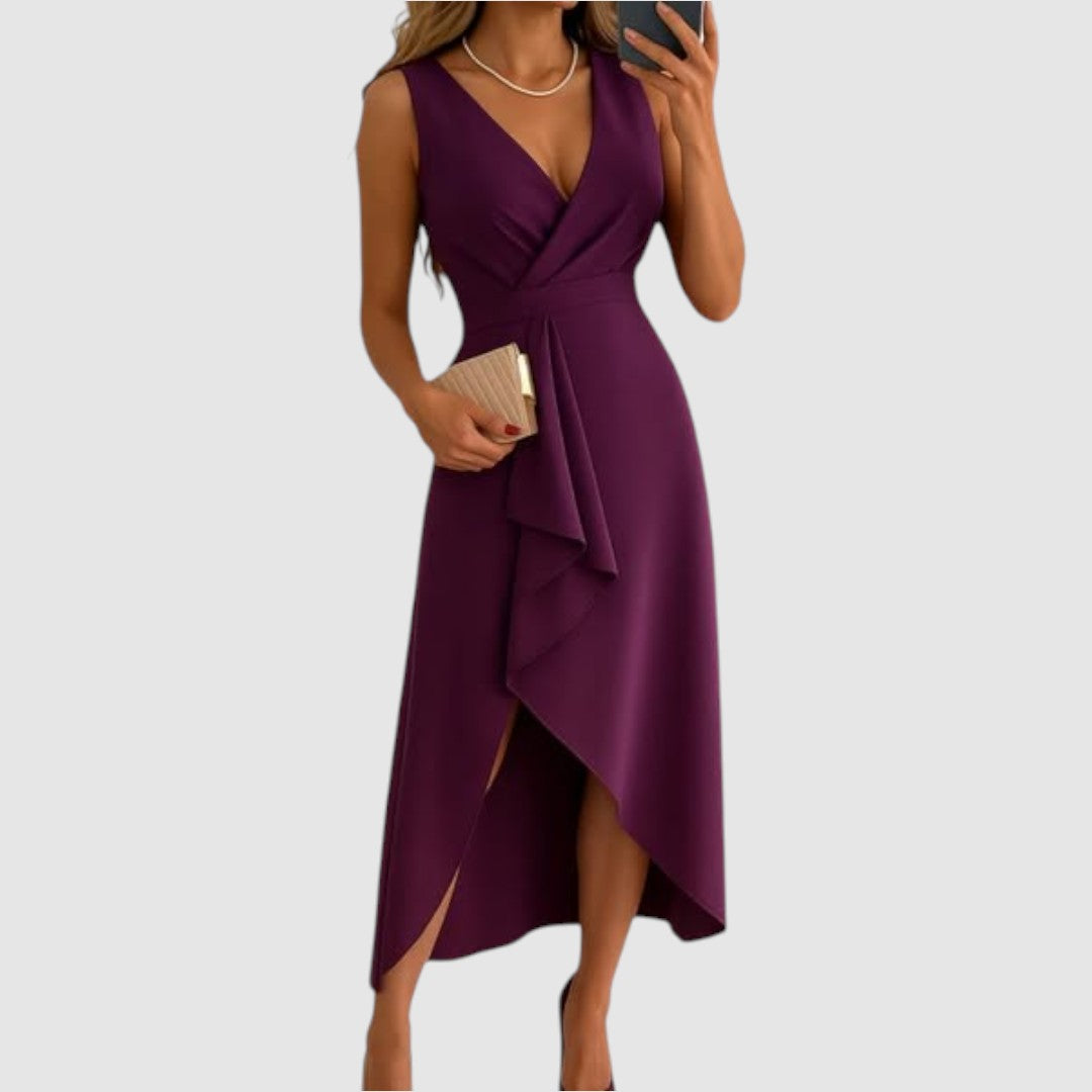 Okouzlující šaty s moderním asymetrickým střihem, které podtrhují ženskou siluetu a dodávají outfitu nádech sofistikovanosti. Hlubší výstřih a decentní volání v přední části působí žensky a elegantně. Perfektní volba pro svatby, večerky nebo jiné slavnostní události.